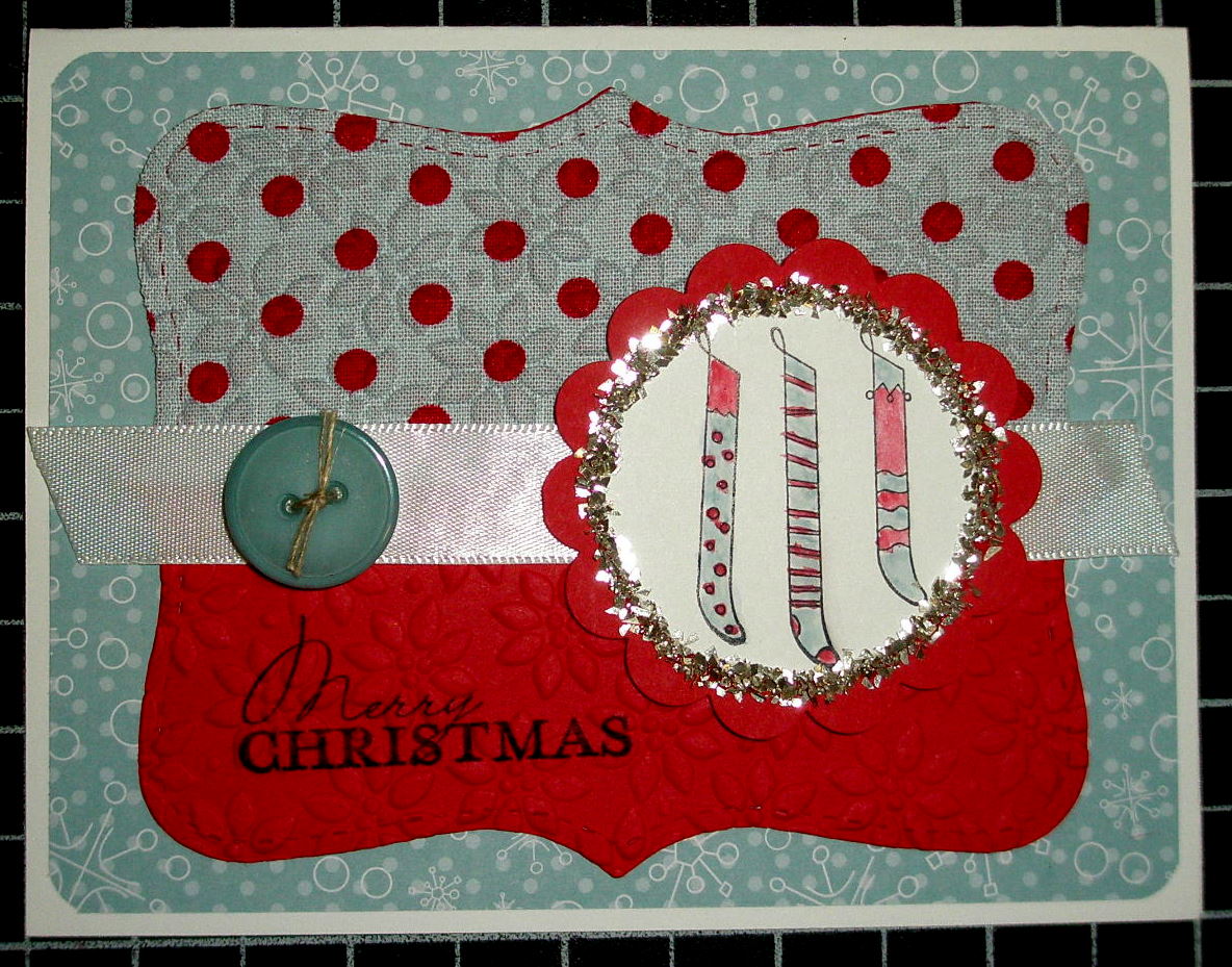 Just a quick posting to wish all of you a beautiful day and to share my last Christmas project with you. I'm so sad because tomorrow I will be packing all my beautiful Christmas Stampin' Up product in a box to, hopefully, use most of it again next year. I can honestly say that I did not get to use all of my Christmas stamps this year (I even have one set that did not get mounted -- I know, I can't believe I am admitting to that, but it is a set I won and did not get a chance to use). I will keep a few stamps out to use with Winter birthday cards and for a few scrapbooking pages for my Christmas pictures. I do have to say, the company (Stampin' Up) created some of the most gorgeous stamp sets this year I have ever seen (anywhere). Along with the fabric and other accessories, they really came through with the very best product on the market.